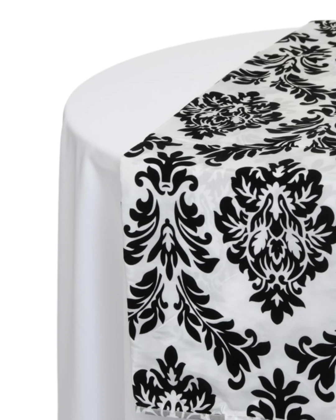 A stylish white table runner with black flock brocade.